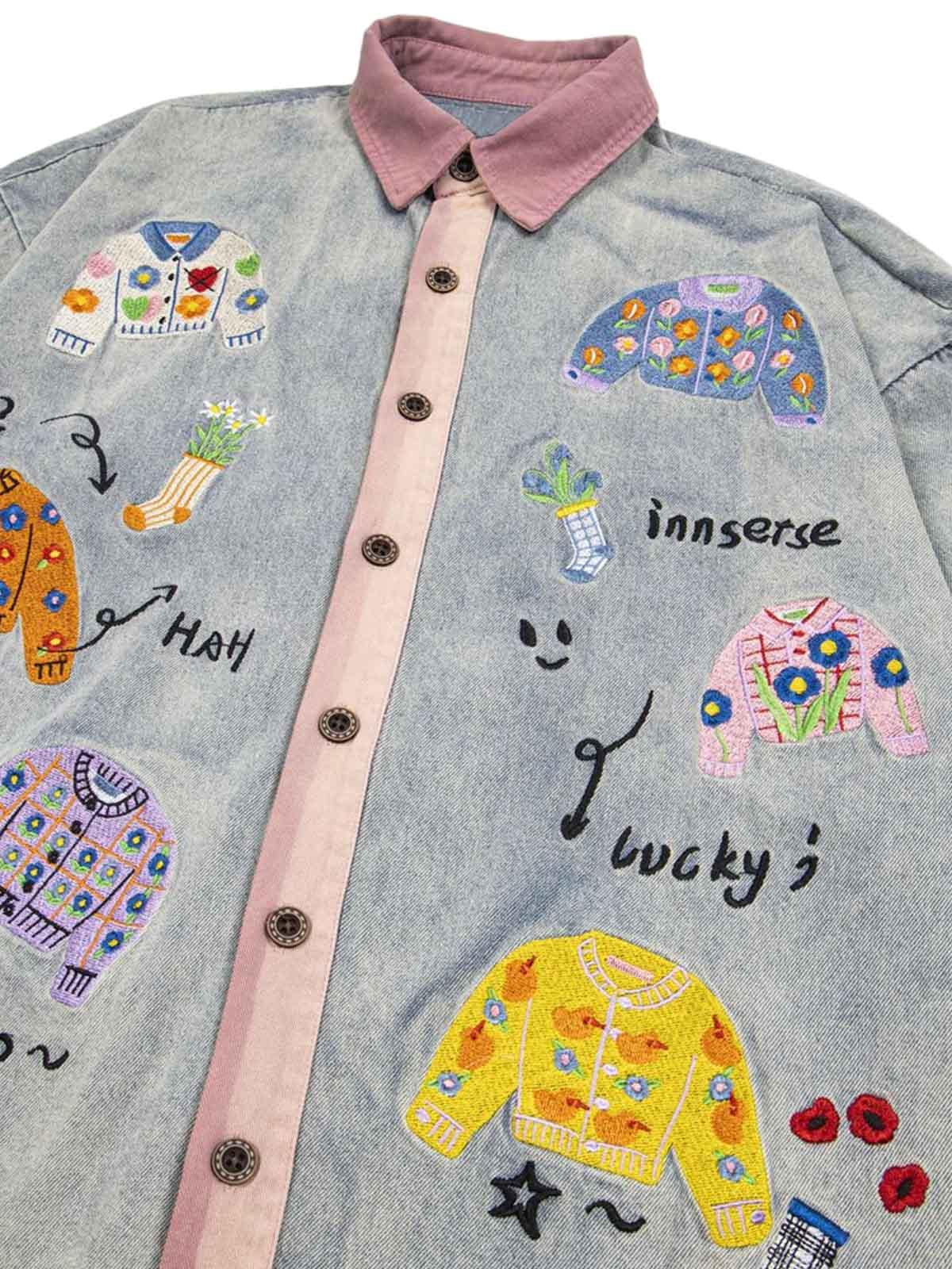 Embrace a playful vibe with this denim shirt, where whimsical embroidery meets urban style. The vibrant mix of colorful sweater patches and quirky details create a standout piece that breaks the mold of ordinary streetwear fashion. The faded blue denim is perfectly contrasted by a bold pink collar and cuffs, making it a versatile choice for both y2k outfits and modern street looks. Available in M, L, and XL, this shirt offers a relaxed fit that effortlessly pairs with your favorite jeans or cargos. Grab yours and let your wardrobe reflect your unique style.