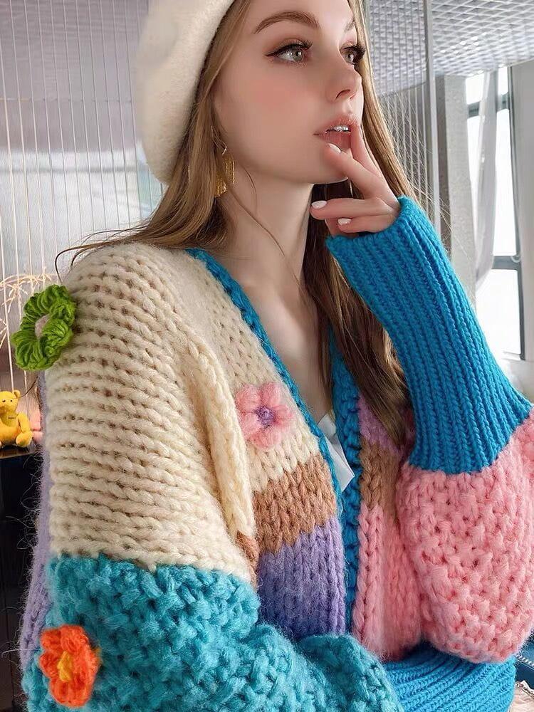 Bring a burst of color and texture to your streetwear fashion with this vibrant cardigan, where chunky knit meets playful charm. The soft hues of pink, purple, and cream collide with bright blue cuffs, creating an eye-catching palette that’s both bold and cozy. Adorned with adorable floral accents, this piece brings a touch of whimsy to any urban ensemble. Available in XS, S, and M, its relaxed fit ensures comfort while making a statement. Whether you’re pairing it with jeans or layering it over your favorite Y2K outfits, it’s all about bringing those outfit ideas to life with flair. Ready to redefine your cool-weather style?