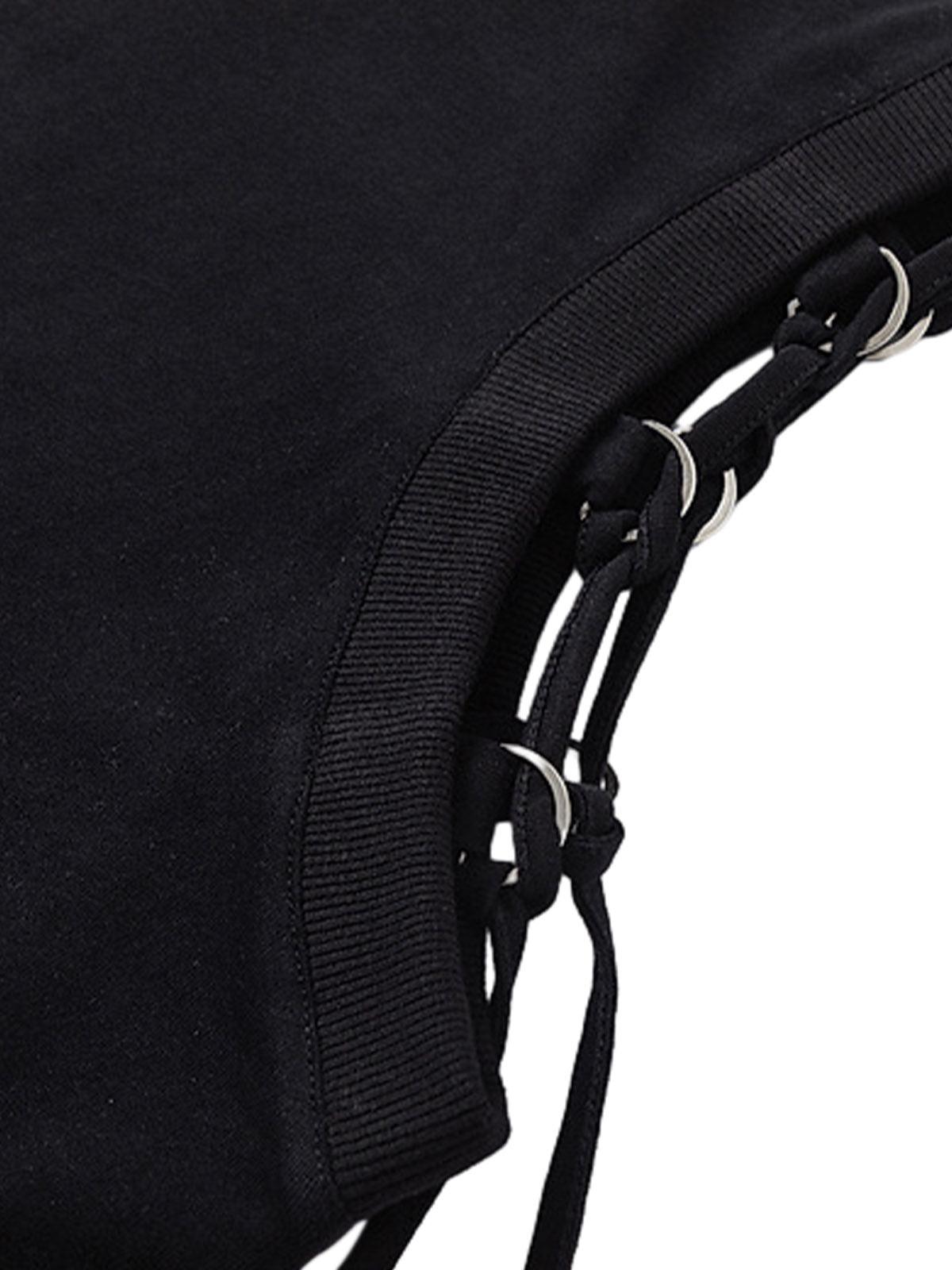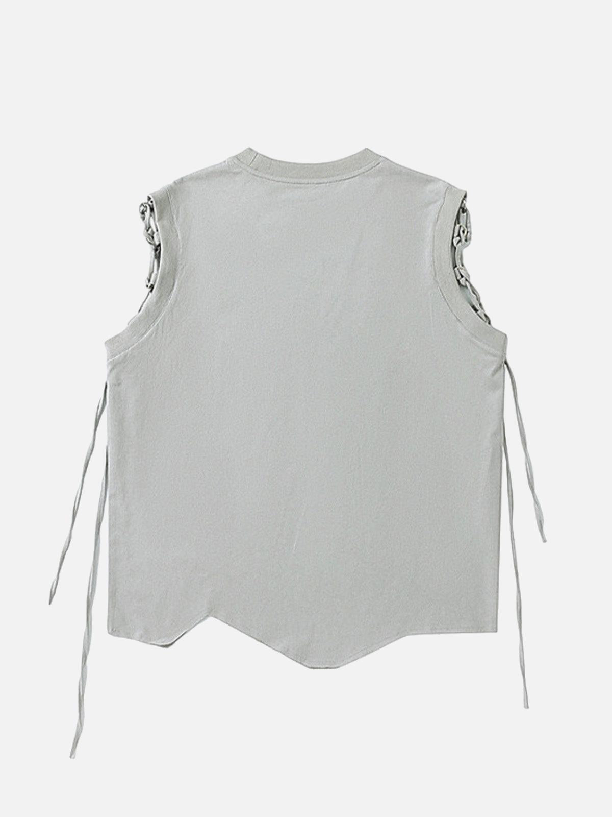 Unleash your rebellious side with this edgy sleeveless tee, featuring a bold graphic print and intricate side lace-up details that redefine streetwear fashion. The soft gray fabric exudes a cool, laid-back vibe, while the asymmetrical hem adds a unique twist to your outfit. Whether you’re rocking it solo in the summer heat or layering it under a jacket for those chillier nights, this piece offers versatility in sizes ranging from S to XL. Pair it with distressed jeans or joggers for that effortless urban look. Dare to own the streets with confidence.