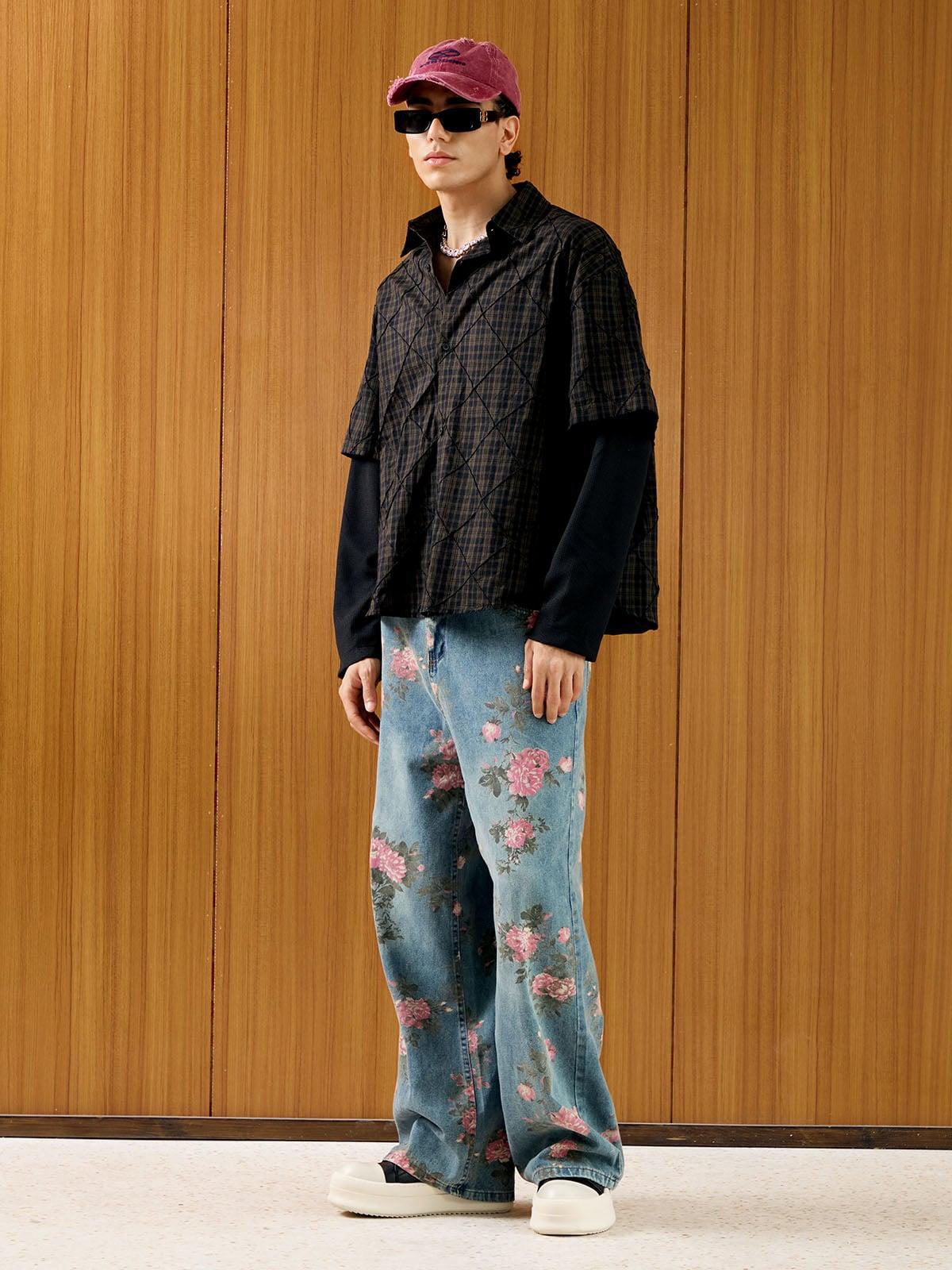 Embrace the unexpected fusion of textures and patterns with this bold, quilted short-sleeve shirt. Its deep black colorway brings a sleek edge, while the intricate check design adds depth and sophistication, perfect for layering over long sleeves or pairing with your favorite distressed denim. Available in M, L, and XL, this piece offers an effortlessly relaxed fit that caters to your unique streetwear fashion vibe. Let it become your go-to choice for creating standout y2k outfits that speak volumes without saying a word. Elevate your wardrobe with this essential piece that promises to redefine your outfit inspo.