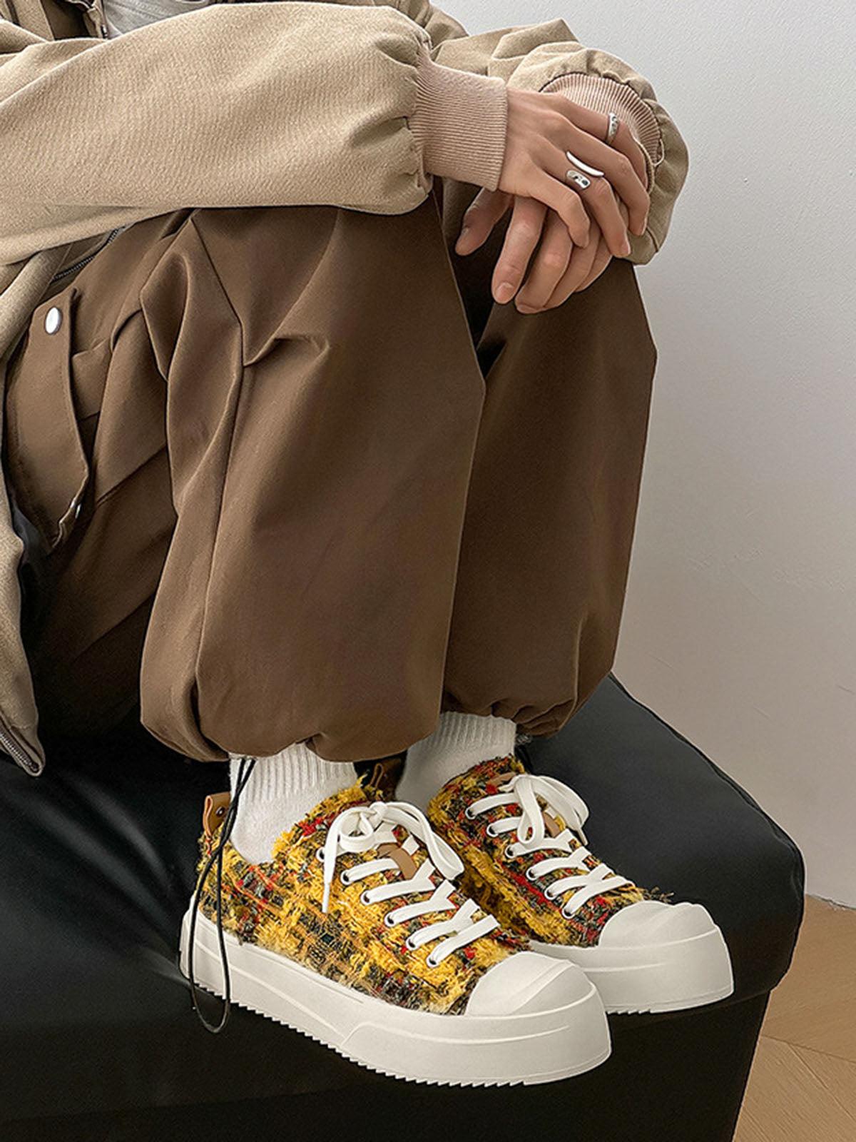 These Retro Canvas Irregular Sneakers from TALISHKO are your go-to for Spring and Autumn urban adventures. Featuring a unique plaid pattern and a chunky sole, they merge style with comfort, ensuring support during your daily outings, school runs, or leisure activities. The white lace-up closure offers a versatile fit, making them a bold addition to any streetwear ensemble.