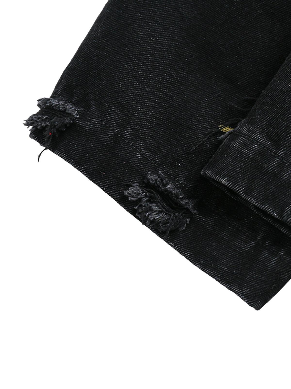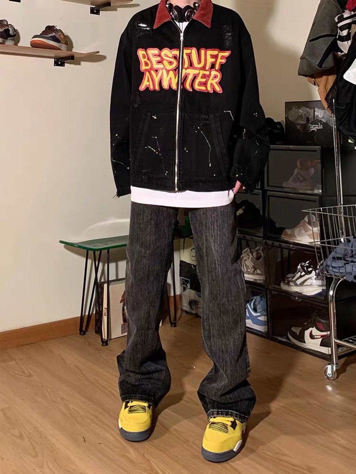 Step into the scene with a jacket that’s not just clothing, but a canvas of urban rebellion. The bold black backdrop is fiercely contrasted by a vibrant red collar and striking graffiti-inspired text, making it a centerpiece for any streetwear fashion ensemble. Distressed details and splashes of paint create an unapologetic vibe that screams individuality. Available in versatile sizes from M to 2XL, this jacket offers a relaxed fit that pairs perfectly with both your everyday essentials and daring y2k outfits. Ready to transform your outfit ideas into reality? This piece is your go-to.