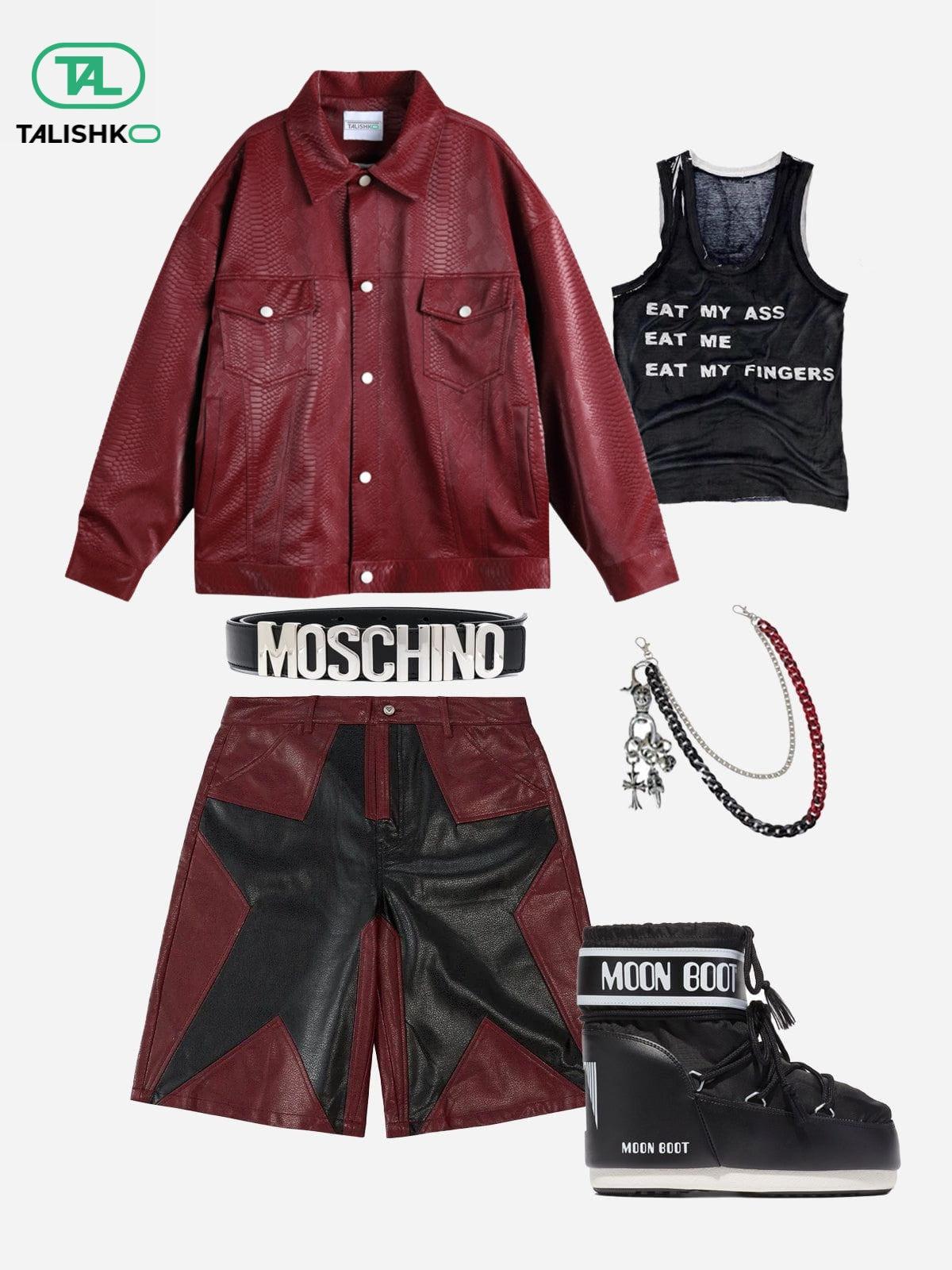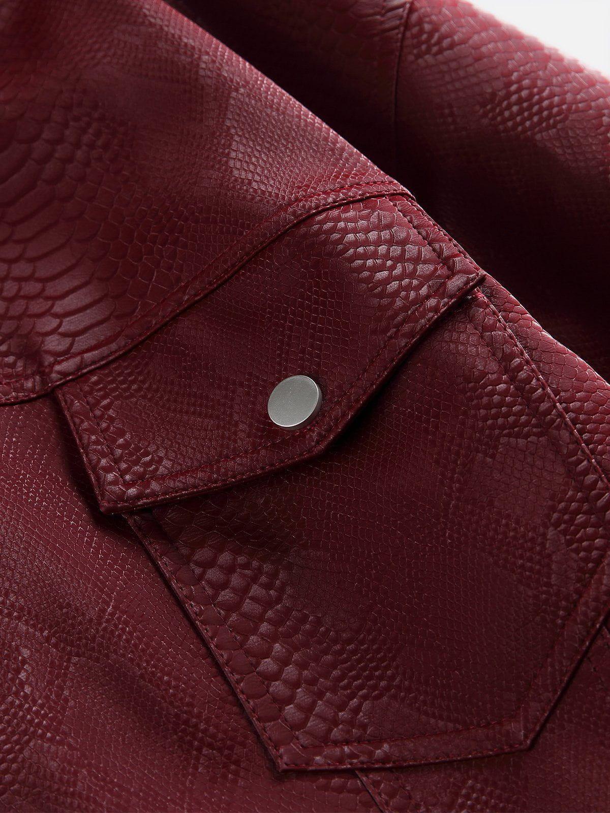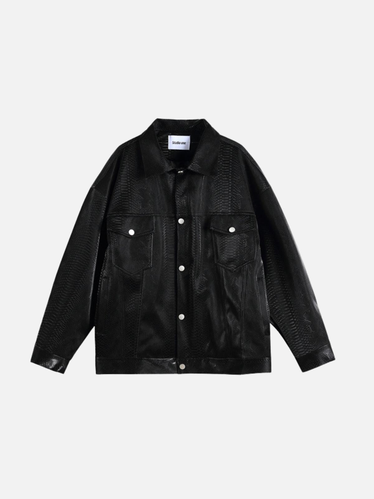 Embrace the urban jungle with this jacket that roars with a fierce snakeskin texture, designed to turn sidewalks into your personal runway. This striking red piece, also available in sleek black, offers a bold twist on classic streetwear fashion, making it a versatile staple for any wardrobe. The structured fit ensures it layers perfectly over your favorite tee or hoodie, while the durable buttons and spacious pockets add both style and practicality. Available in sizes S, M, L, and XL, it’s ready to complement your unique vibe. Pair it with your go-to sneakers and step out with confidence.