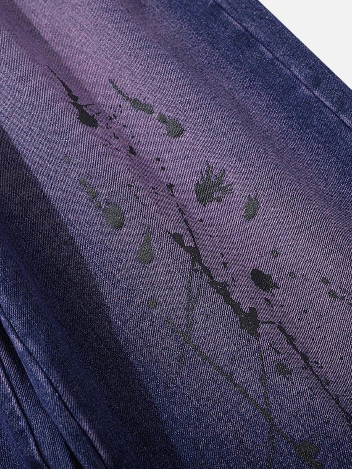 Transform your streetwear game with these striking wide-leg pants, showcasing a bold interplay of deep purple and black hues that evoke a daring urban vibe. The subtle fade effect and abstract black splatter design add a touch of artistic flair, perfect for those who embrace the unexpected. With a relaxed fit and elastic waistband, these pants offer both comfort and edge, making them a versatile piece for any wardrobe. Available in sizes XS to L, they pair effortlessly with your favorite sneakers or boots for an authentic y2k outfit inspo. Elevate your style and make these your go-to for standout streetwear fashion.