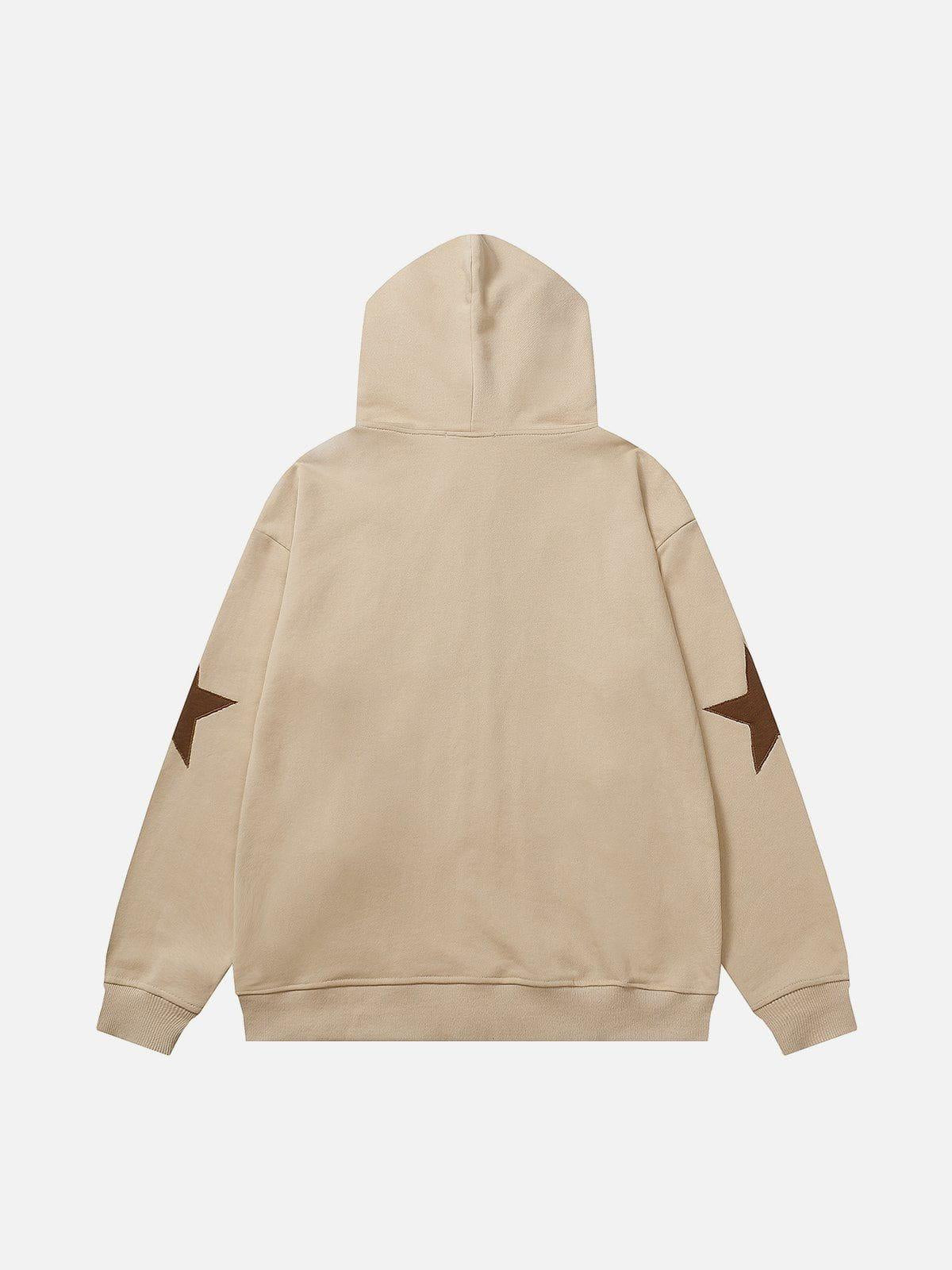 Turn heads with a bold star motif that electrifies this oversized hoodie, blending urban edge with relaxed comfort. The soft apricot hue, accentuated by striking brown stars, offers a seamless fit into any streetwear fashion lineup. Available in sizes S to XL, this piece ensures everyone can embrace its laid-back vibe. Whether layered over your favorite tee or paired with camo pants for that ultimate y2k outfit inspo, it’s a dynamic addition to your wardrobe. Zip up and step out with confidence.