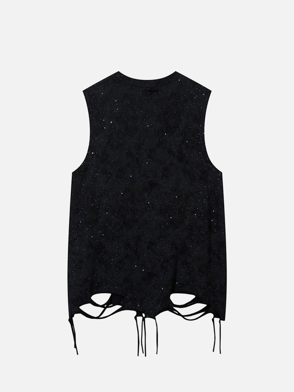 Break the mold with a sleeveless design that marries edgy distressing and a cosmic speckled fabric for a look that screams streetwear fashion. This tank, available in both sleek black and crisp white, offers a versatile punch to your wardrobe. The relaxed fit drapes effortlessly in sizes from M to 2XL, letting you layer with abandon or rock it solo for those hot urban nights. Pair with ripped jeans or cargo shorts for ultimate outfit inspo, and let the raw hem do the talking. Ready to redefine your style game?