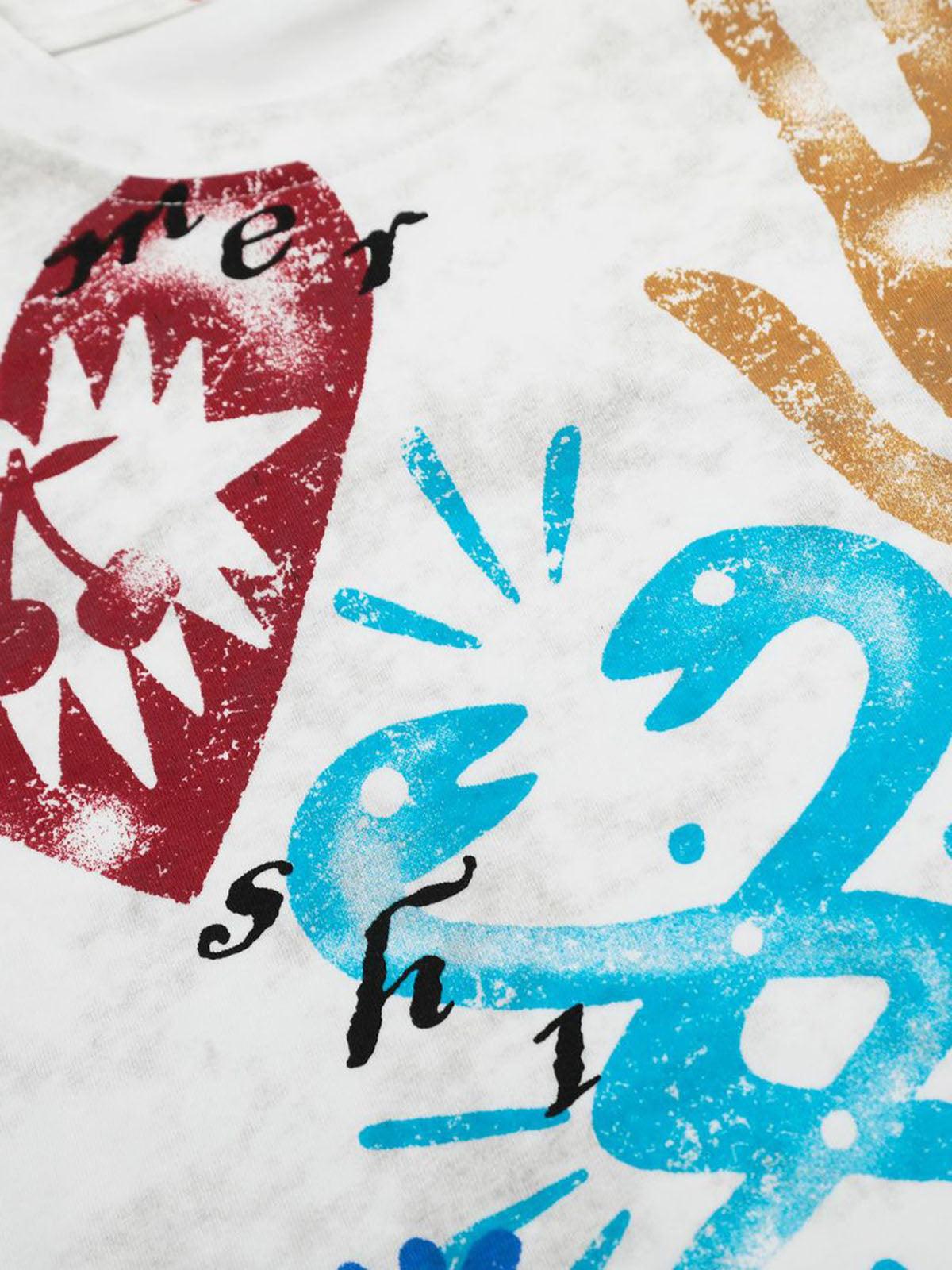 Unleash your inner artist with this bold graphic tee, where vibrant symbols collide in a kaleidoscope of summer vibes. The striking mix of colorful motifs, including hearts, hands, and nature-inspired graphics, pops against the crisp white fabric, creating a statement piece that’s perfect for any urban adventure. Designed for comfort and style, this tee offers a relaxed fit available in M, L, and XL, making it a versatile addition to your summer outfit rotation. Pair it with distressed jeans or shorts for an effortlessly cool look that turns heads. Embrace the energy and let your style speak volumes.