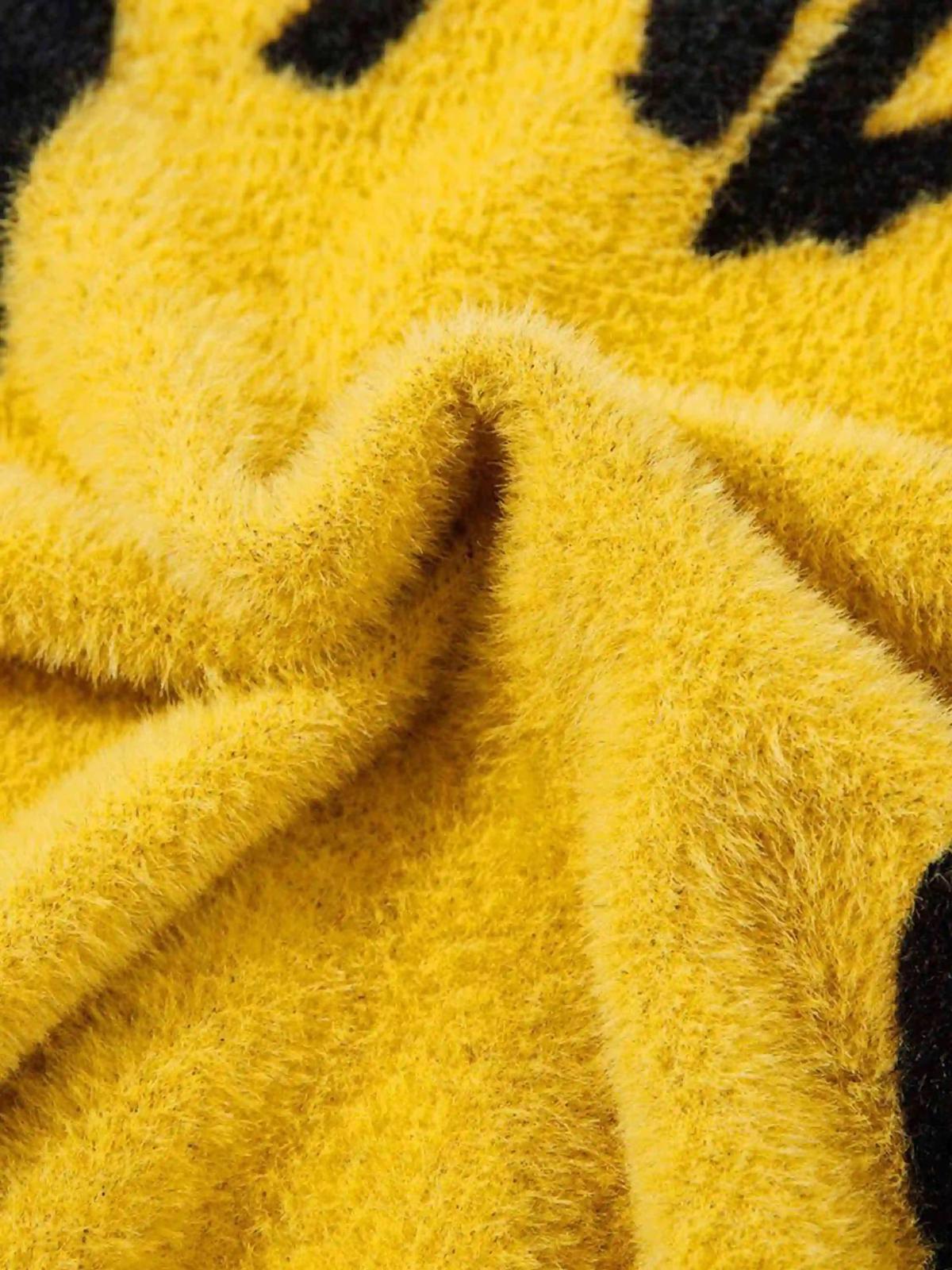 Break the mold with this bold, smiley-infused sweater that screams confidence and urban flair. Draped in vibrant yellow, this piece features edgy black graphics that pop with every move, making it a staple for anyone diving into streetwear fashion or channeling y2k vibes. The soft texture ensures a relaxed fit, available in sizes from S to XXL, offering both comfort and style for every body type. Pair it with your favorite jeans or layer it over a sleek skirt for endless outfit inspo. Grab yours now and redefine your everyday wardrobe.
