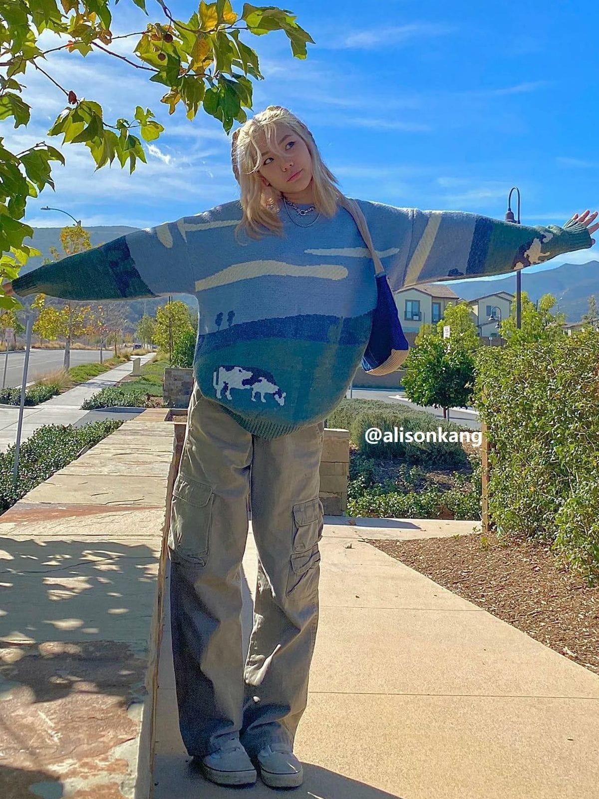 Embrace the chill with this tapestry of pastoral vibes, where serene landscapes in soft gray and deep green weave together on a cozy knit canvas. The relaxed fit drapes effortlessly, offering comfort in every movement, while the intricate scene of grazing animals adds a touch of whimsy to your urban wardrobe. Available in sizes from S to XL, this piece invites you to layer over your favorite streetwear essentials, making it a perfect partner for your boldest y2k outfits. Slide into this blend of art and fashion, and let your style roam free.