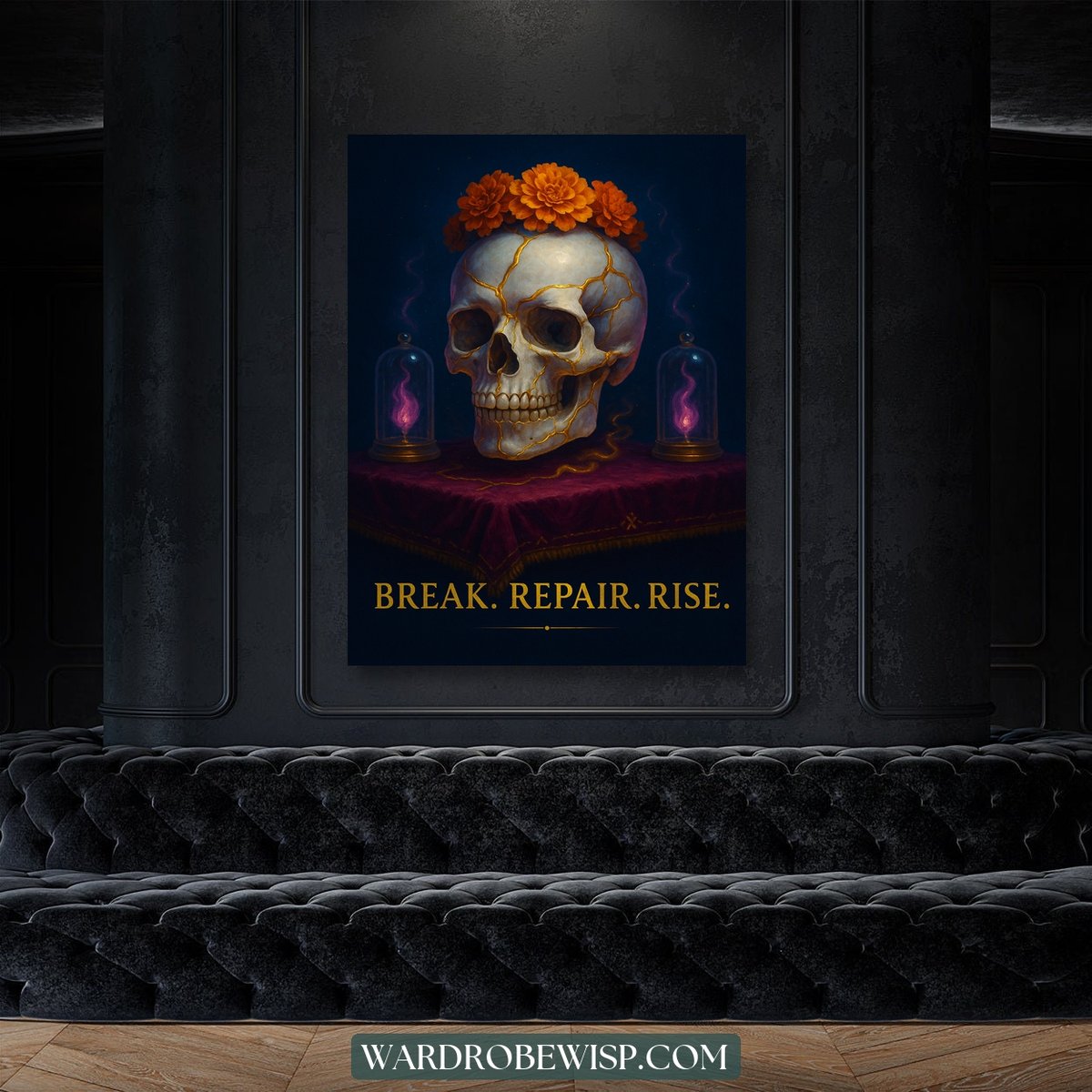 Just hung my Kintsugi Skull canvas and I’m obsessed! The marigold details are just stunning, adding a pop of color to my otherwise dark room. 😍 It totally gives off those Day of the Dead vibes I love!